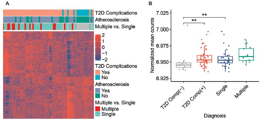 该研究入组了62例2型糖尿病病人,采用5hmC-Seal技术对血浆cfDNA中表观遗传标志物5hmC的分布情况进行检测,分析5hmC标志物与2型糖尿病血管并发症发生发展的相关性。结果表明5hmC标志物的变化与T2D合并大血管/微血管事件具有相关性,主要涉及一些与血管生物学和糖尿病(包括胰岛素耐受和炎症反应)相关的基因和信号通路。该研究建立的16个基因-5hmC标志物组合检测可以准确区分有并发症和无并发症的2型糖尿病病人[实验组:AUC=0.85;95% CI,0.73-0.96],明显优于传统临床变量例如白蛋白尿。除此之外,还建立了13个基因-5hmC标志物组合检测,可以进一步区分T2D合并单一并发症和多种并发症[实验组:AUC=0.84;95% CI,0.68-0.99],同样明显优于其他传统临床变量。该研究得出结论,5hmC标志物反映了T2D病人大血管/微血管并发症发生过程中的表观遗传变化,因而5hmC-Seal检测技术在监测糖尿病血管并发症发生和进展方面具有良好的临床应用前景。
