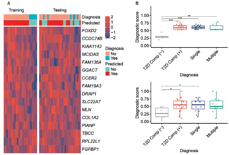 62例2型糖尿病病人被随机分成训练组(n=31)和测试组(n=31)。利用弹性网络筛选后发现,16基因-5hmC标志物组合检测可以用于区分有并发症和无并发症的2型糖尿病病人。
