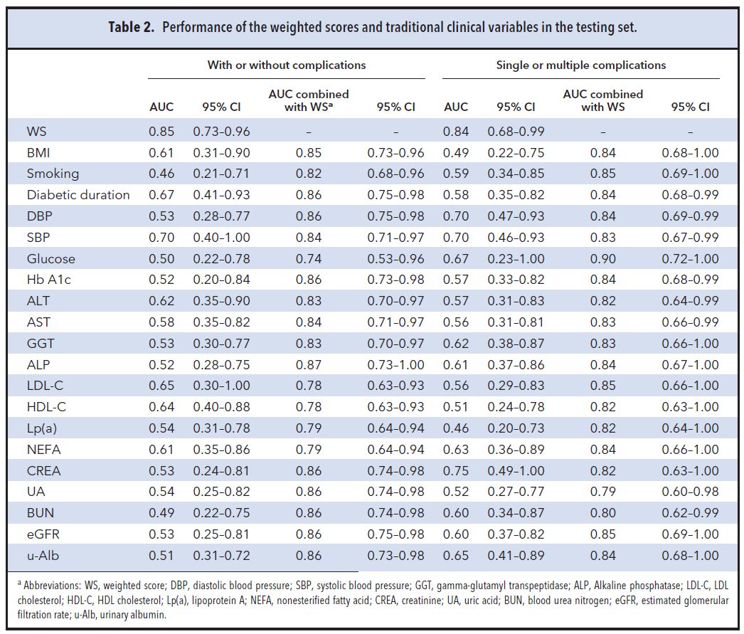 总体来说,结果表明一些临床变量(如尿液白蛋白、血清ALT、AST、肌酐、GGT、脂蛋白a)虽然具有一定的灵敏度和特异性,但是整体准确度仍然差强人意,因此临床需要更加准确的方法。另外,我们还在训练组中建立5hmC和不同临床变量的多变量组合模型进行评估,该模型加权平均分的AUC要明显大于传统临床变量的AUC。若将这些临床变量与加权平均分进行结合,AUC也将进一步提高。因此,该多变量模型表明加权平均分可作为一个独立的指标用于监测2型糖尿病血管并发症。